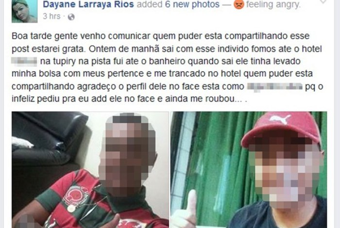 Dayane escreveu em um post que o cliente levou sua bolsa quando ela estava no banheiro. “Ele me pagou, mas quando eu fui ao banheiro, ele levou a minha bolsa com todos os meus pertences e me trancou no motel. Quem puder compartilhar o perfil dele eu agradeço, porque o infeliz pediu para adicioná-lo no Facebook e ainda me roubou. Que bonito”, desabafou.