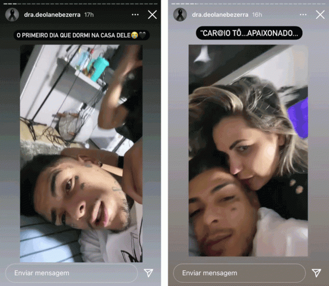 Durante as filmagens compartilhadas por Deolane, o casal troca mensagens de afeto. “Vou te apresentar para minha mãe”, diz Deolane. “Sua mãe vai me amar, meu: ‘Menina, o que você arrumou?'”, brinca Kevin. “Mano, o que leva uma pessoa a tatuar a própria cara?”, pergunta a advogada. “Aposentadoria”, responde o funkeiro. “Você já imaginou você velho? Mano você vai ser um velho com a cara toda tatuada”, brinca Deolane.