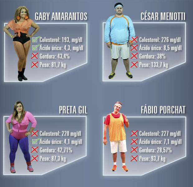 Durante os primeiros exames para avaliar as condições de saúde de cada um deles, o Fábio, mesmo sendo o mais magro visualmente (considerando a altura), tem o colesterol mais alto, fator muito perigoso para a saúde. E a Gaby, que está com o colesterol dentro do aceitável, tem a gordura corporal mais alta entre os demais. Dê uma olhada: