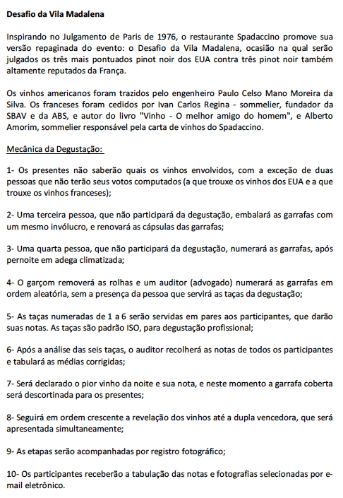 Inspirando no Julgamento de Paris de 1976, o restaurante Spadaccino promove sua versão repaginada do evento: o Desafio da Vila Madalena, ocasião na qual serão julgados os três mais pontuados pinot noir dos EUA contra três pinot noir também altamente reputados da França.