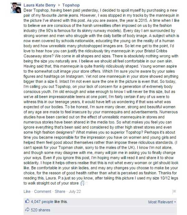 Com apenas uma postagem no Facebook, esta britânica conseguiu mudar os manequins de uma famosa loja de roupas, a Topshop: na semana passada, Laura Berry resolveu experimentar um novo jeans da marca britânica — mas ela foi surpreendida por um manequim com “formas ridículas” na entrada do estabelecimento. + Namorado homenageia pai de noiva em pedido de casamento […]